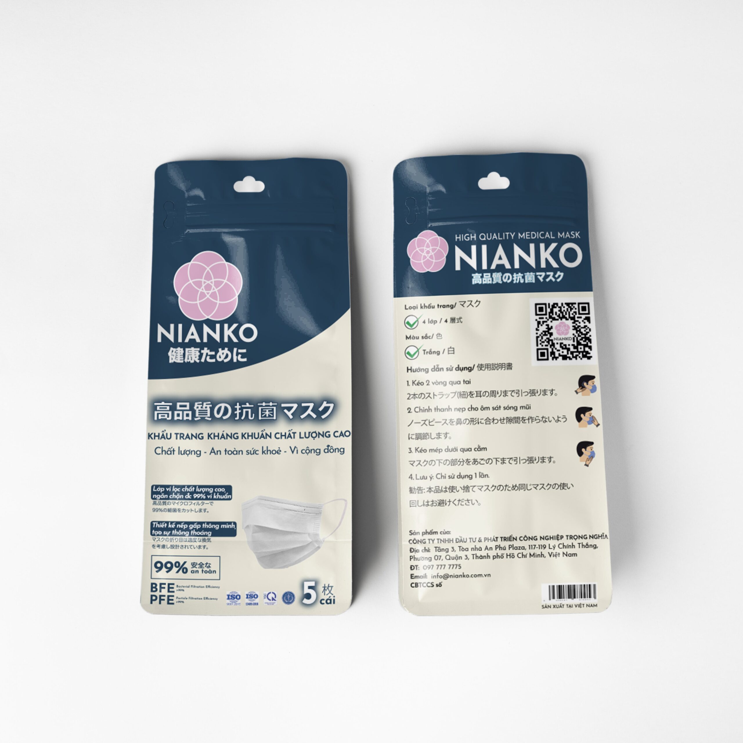 Bao 5 cái Khẩu trang Kháng khuẩn NIANKO (4 lớp màu trắng)